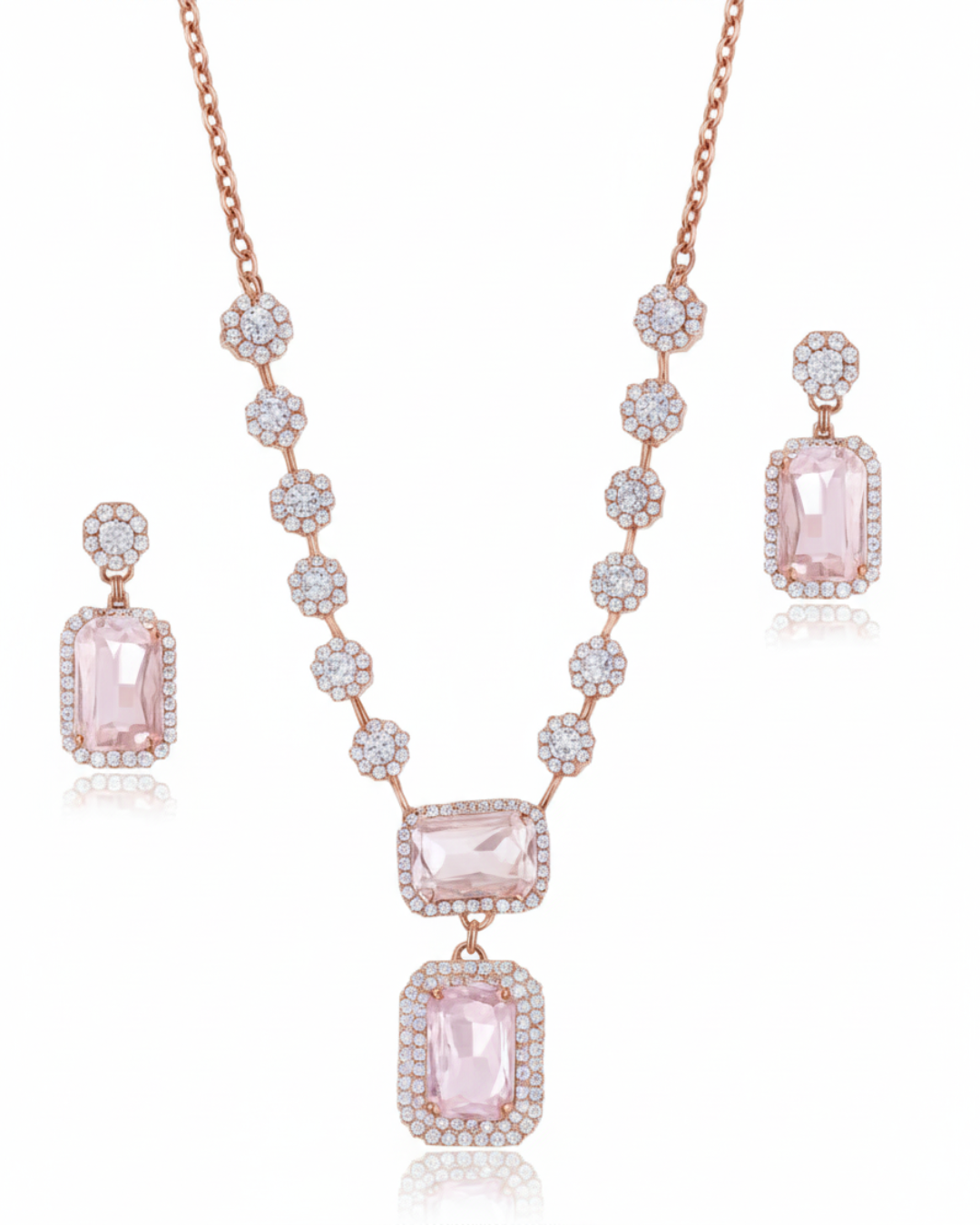 Add a sparkle of modern elegance to your collection with the Rose Radiance Necklace and Earring Set. This beautifully crafted set features a rose-gold finish adorned with shimmering floral crystal accents, leading to striking pink cubic zirconia centerpieces that exude sophistication.
